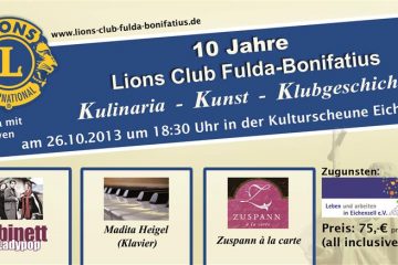 Lions Club Fulda Bonifatius überreicht Spenden in Höhe von 4000.-Euro Eichenzell. Ein voller Erfolg war auch im zehnten Jahr das durch den Lions Club Fulda Bonifatius organisierte Benefizkonzert des Landespolizeiorchester im Ulstersaal in der Rhöngemeinde Hilders. Lionspräsident Gerhard Bub überreichte Weiterlesen…